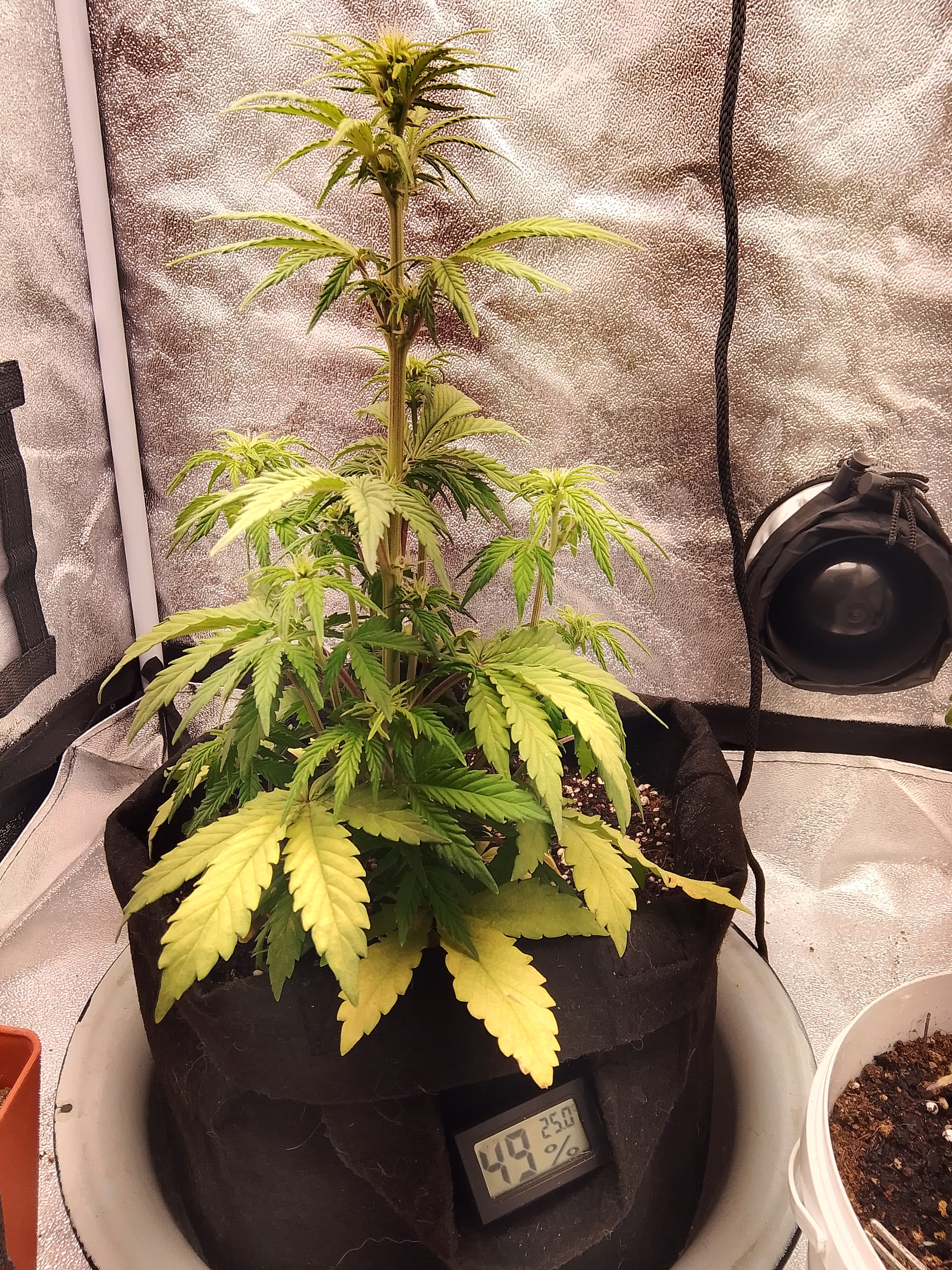 Засадил две бонусные семки с разницей в 10 дней, одна из них потерпела две фатальные пересадки из непромытого кокоса в грунт biobizz light mix, и затем в горшок по-больше в обычный грунт для цветов в котором было 5.0 EC(это дох*я если что, слава богу заметил позже при проливе и исправил). Сказать что я ох*ел - ничего не сказать, растишка была присмерти дважды из-за моих кривых рук, я уже думал выбросить на помойку, потому что выглядила она так, словно уже умерла, вся желтая, листва полуживая. Но спустя 3 дня после промывки грунта она ожила, окрепла, быстро вернула фототропизм и восстала из мертвых, начала быстро набирать мощь, начала направлять верхушку в сторону лампы, желтизна пропала и начала фотосинтезировать как на дрожжах без удобрений. Никогда не видел такого сильного стремления выжить 😊. Хорошо, что не сдался и дал ей шанс на поправку. В такие моменты понимаешь насколько сильная генетика, благодарю за это сидбанк GrowerZ. И да, мои условия не самые подходящие, влажность воздуха достаточно низкая, этот сорт не особо любит низкую влажность и температуру выше 29°C