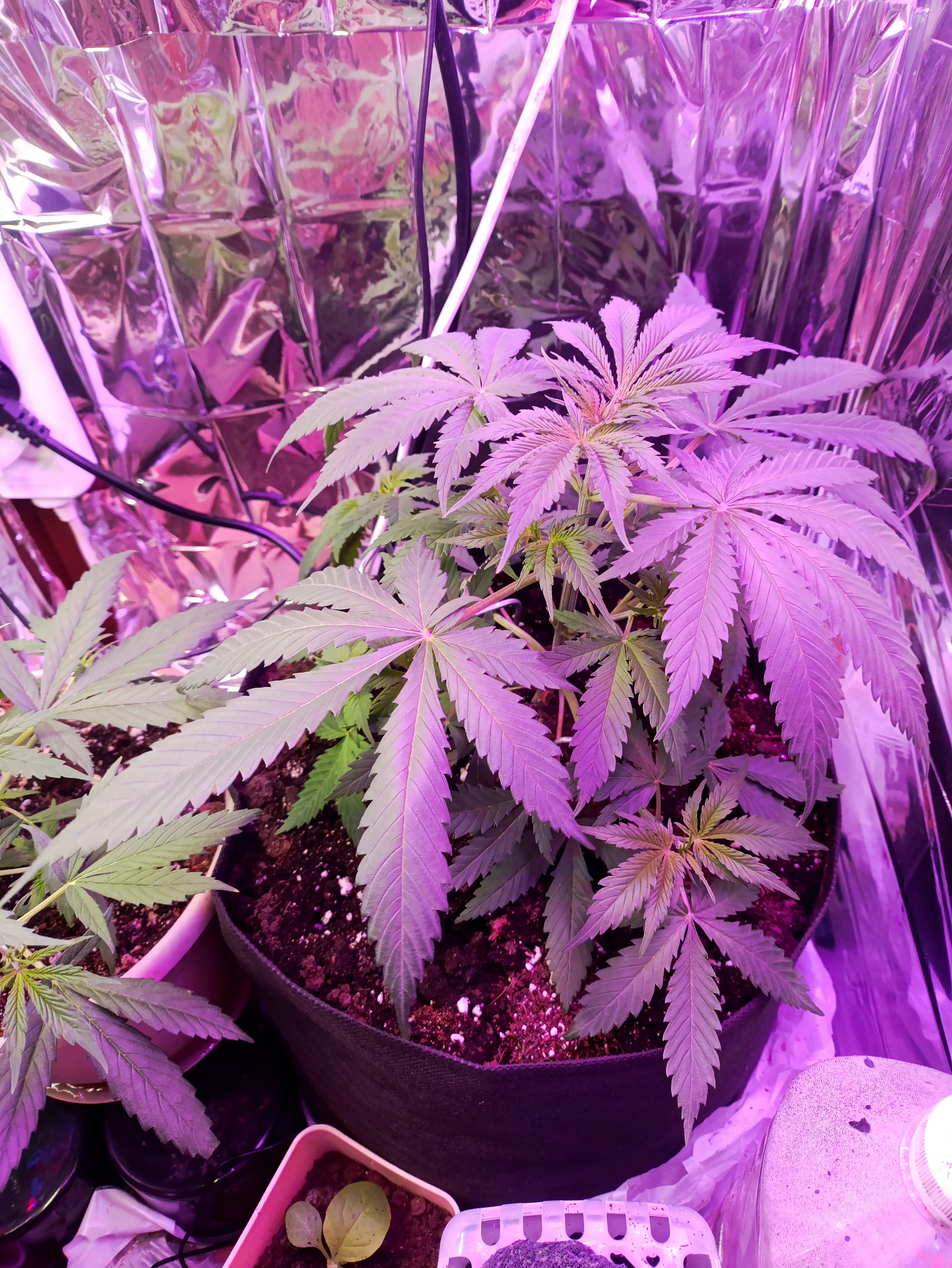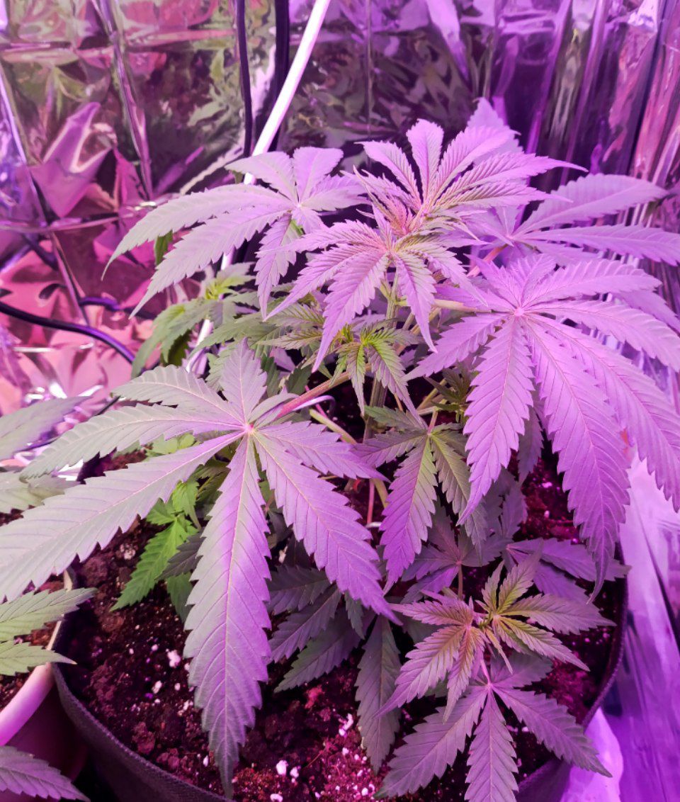 Первые дней 20 рос супер медленно, потом за 6 дней вырос в три раза, на фото 29 день от каски, начали появляться первые пестики, запах появился на 13 день, сейчас с каждым днём всё сильнее, если сравнивать с другими сортами то действительно слабопахнущий, но угольный фильтр лишним не будет, вчера провел последнюю дефолиацию, дабы дать больше света новым веткам и будущим соцветиям, решил на пробу курнуть веерный лист, ну седативный эффект присутствовал ярко выраженный, психоактивного эффекта пока нет) кормить начал по немногу с 20 дня, посадил две семки из 4, две оставил на потом, обе взашли, один специально посадил что б общипывать пока зреет основной) ждём-с)) всем добра и хорошего урожая!